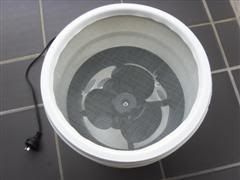 Not my original idea, but thought Id post a couple of pics for those that are interested. Drilled those holes in the bucket with a hole saw. 200mm ceiling fan is an exact fit in the bucket - wedges in tightly without needing to be secured with anything. Mesh screen on top is one of those mesh frypan covers, which is an exact fit in the lid, just needed to cut the handle of it and epoxy it in.