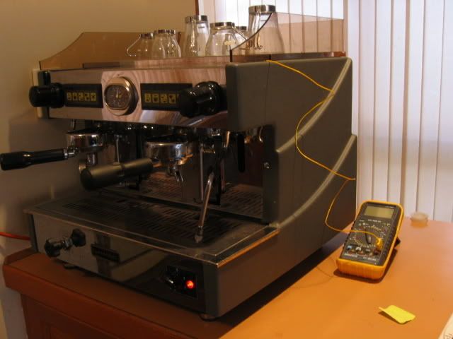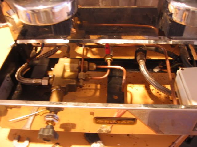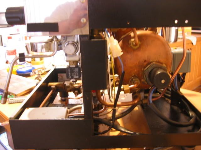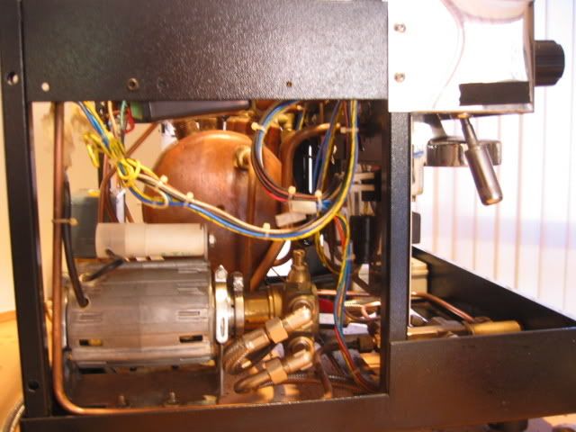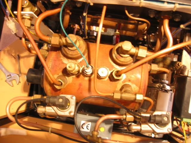 . But produces a great head of steam at low pressure - Set at 0.8 bar. The two heat exchangers are clearly visible to the left and right of the boiler towards the rear. On the middle-top are, from left, safety valve, filler probe (with earth wire) and vacuum break valve.