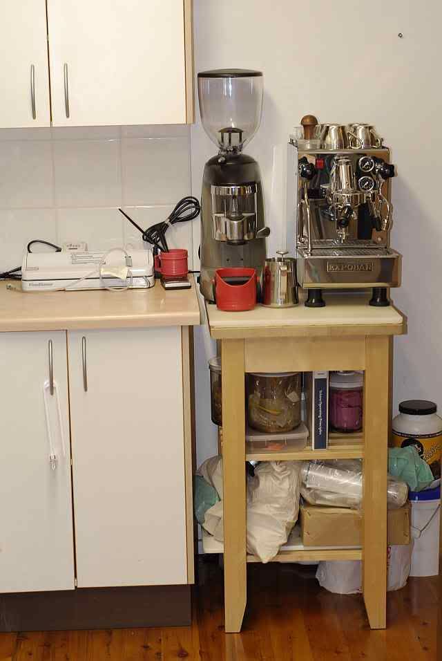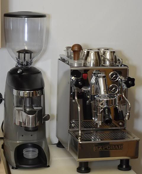 ), and having the griner on the left of the machine makes sense to me (Im r/handed)...I hold the group handle in my l/h and can thwack the mazzer with my right...to me, if the knock box was on the r/h side of the machine it woould be a perfect world. I guess each to their own