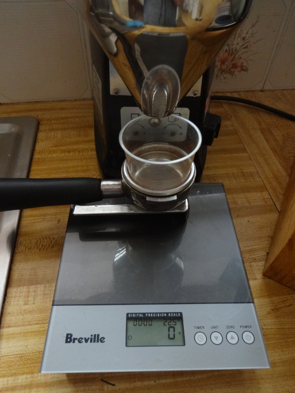 Step 4 - put plastic cup funnel into pf, turn on the scale and ...grind: